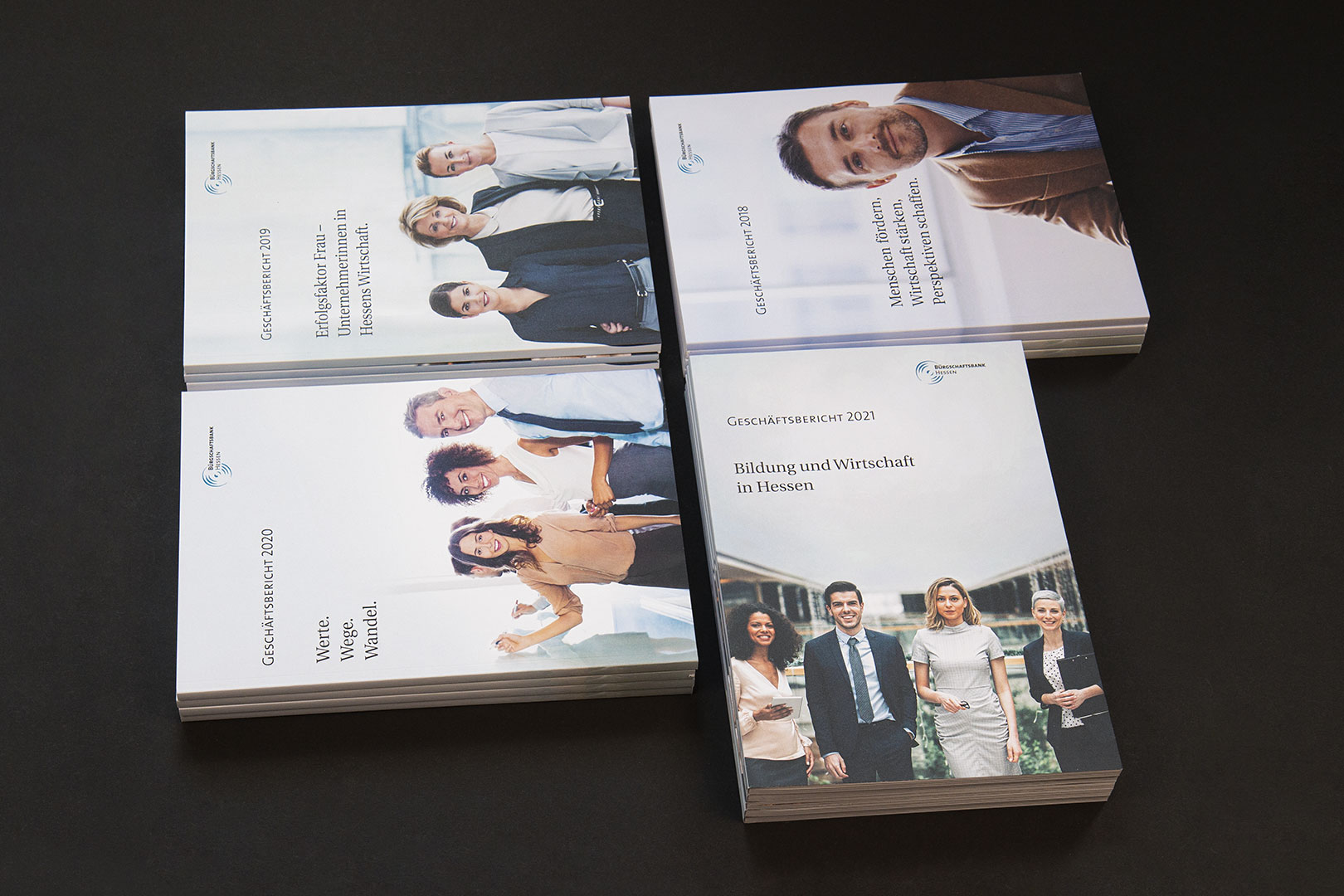 Die neuen Geschäftsberichte der Bürgschaftsbank Hessen sollten – neben dem gesamten Zahlenwerk – nun auch zentrale Werte des Unternehmens sowie ein übergeordnetes Leitthema mit interessant aufbereiteten Inhalten transportieren. Als Ergebnis der vorgelagerten Workshopreihe stellten wir die Menschen in den Mittelpunkt der Kommunikation und entwickelten im Rahmen der CD-Vorgaben eine neue Konzeptserie für weitere vier Jahre.