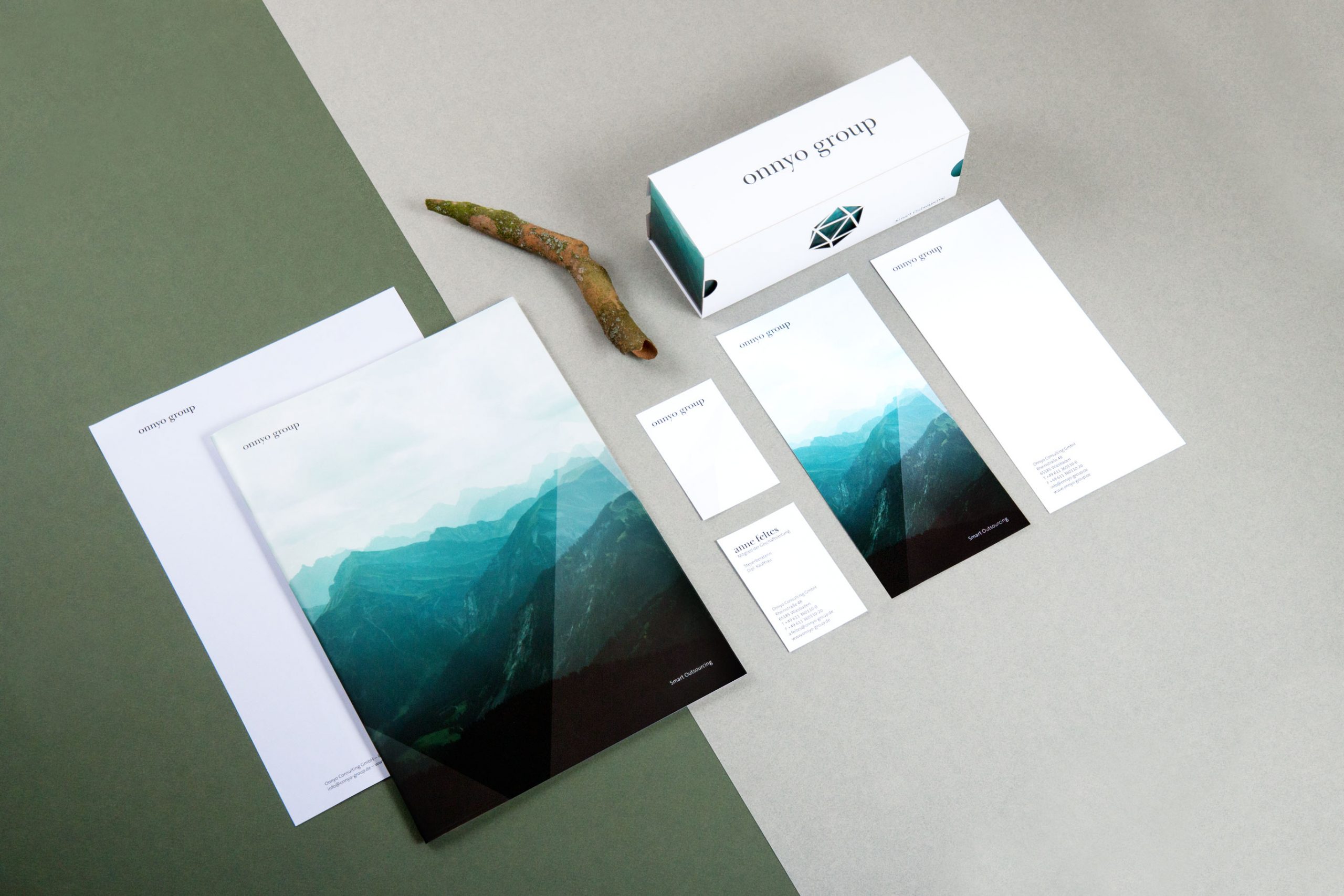 Das Outsourcing von Onnyo muss perfekt funktionieren – immer aufeinander aufbauen, fließend ineinandergreifen und weitsichtig sein. Passend zu diesem Anspruch kreierten wir eindrucksvolle Naturmotive mit viel Weite. Um diese Bildwelt einzigartig zu gestalten, kombinierten wir die Motive mit den platonischen Elementen und schufen durch transparente Überlagerungen eine außergewöhnliche Bildstilistik.