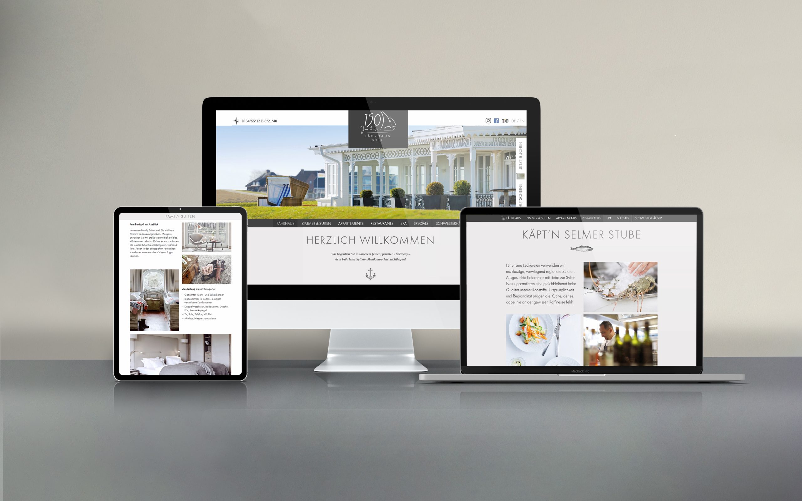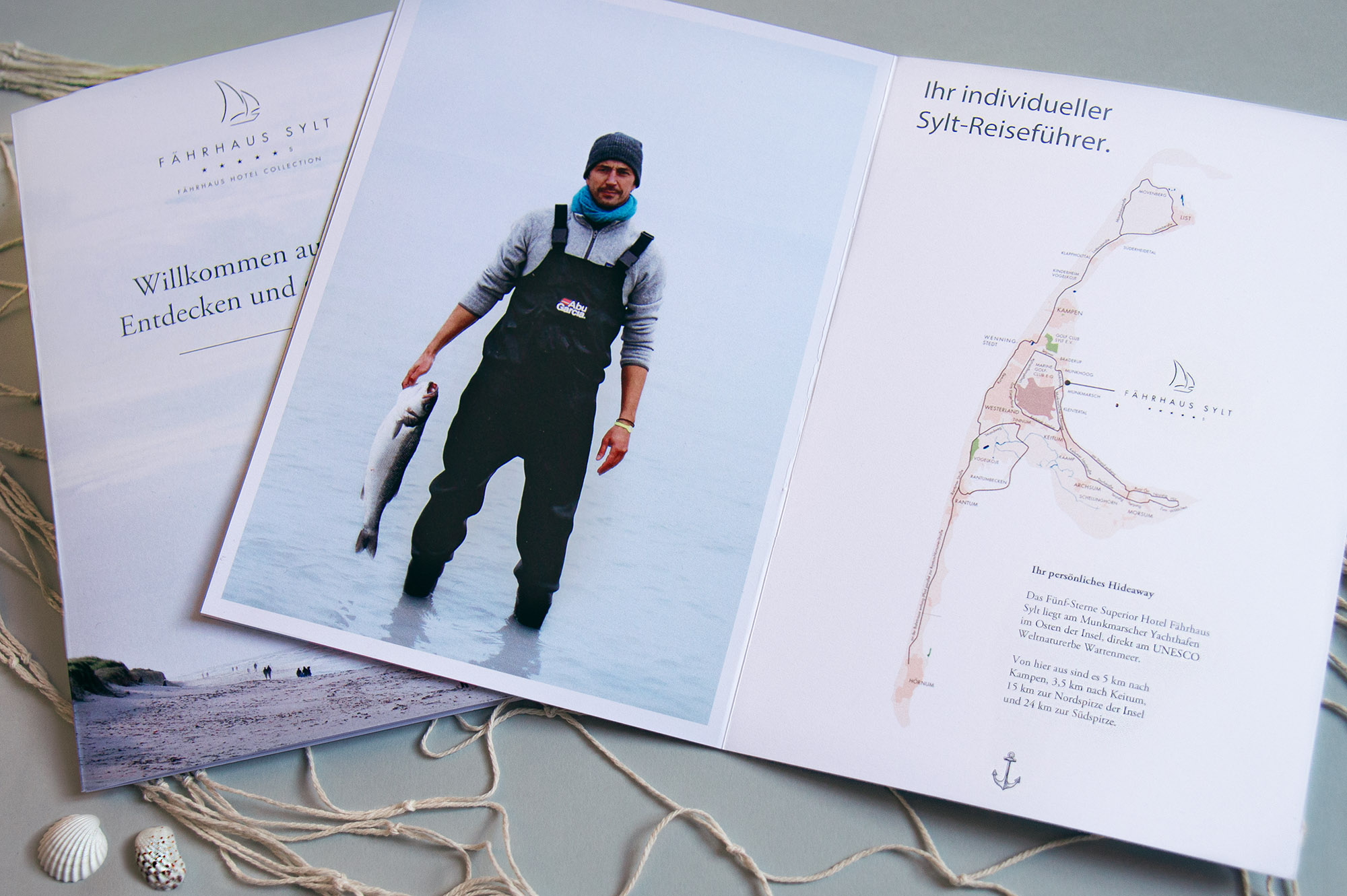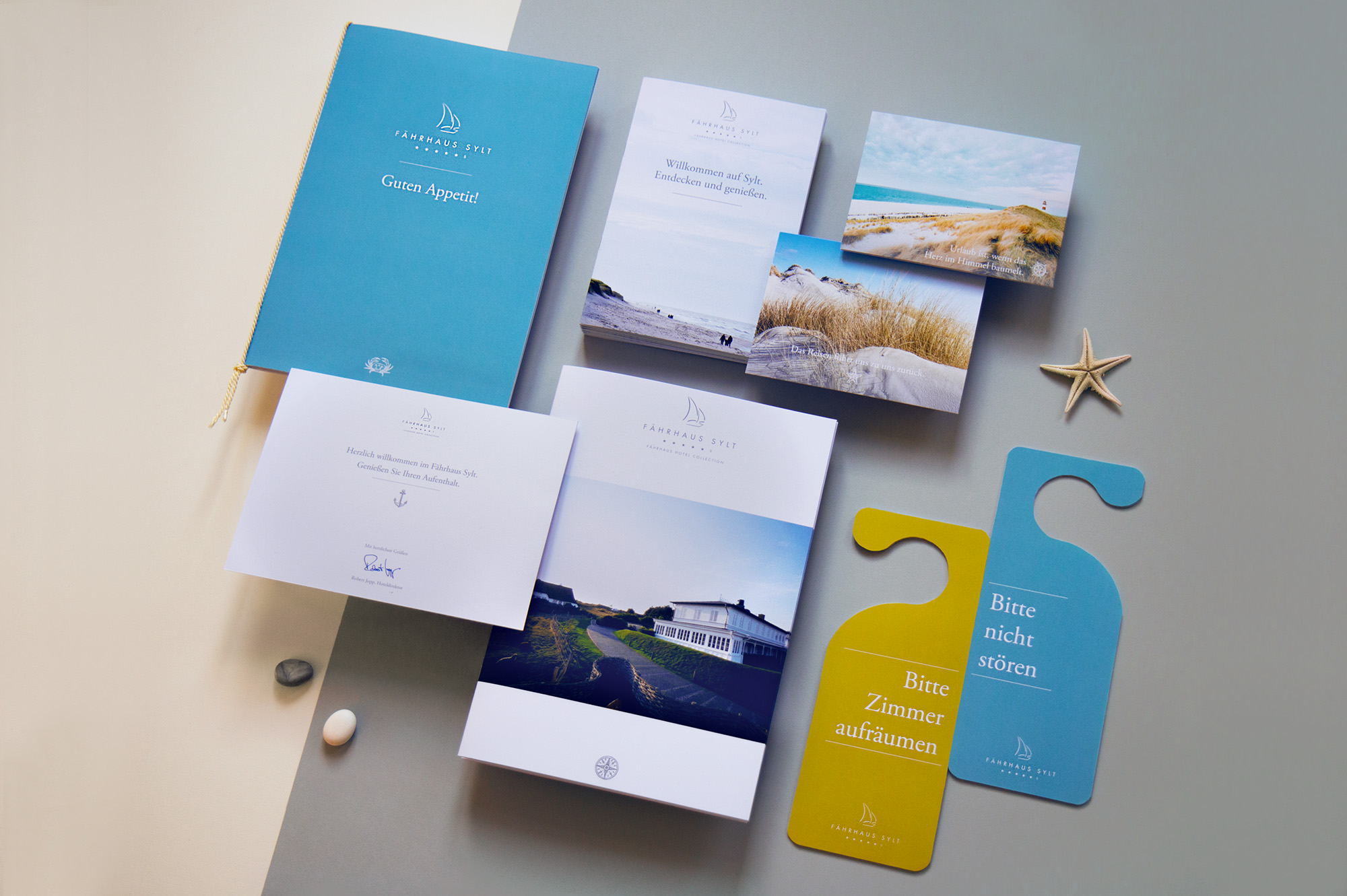 Die Mischung aus privater Gastlichkeit, hochwertigem Interieur und besonderer Kulinarik war der Maßstab für unser „Fährhaus-Designkonzept“, das von nordischen Farben, detailverliebten Illustrationen, feiner Typografie und ästhetischer Fotografie geprägt ist und seine einladende Wirkung über alle Medien entfaltet.
